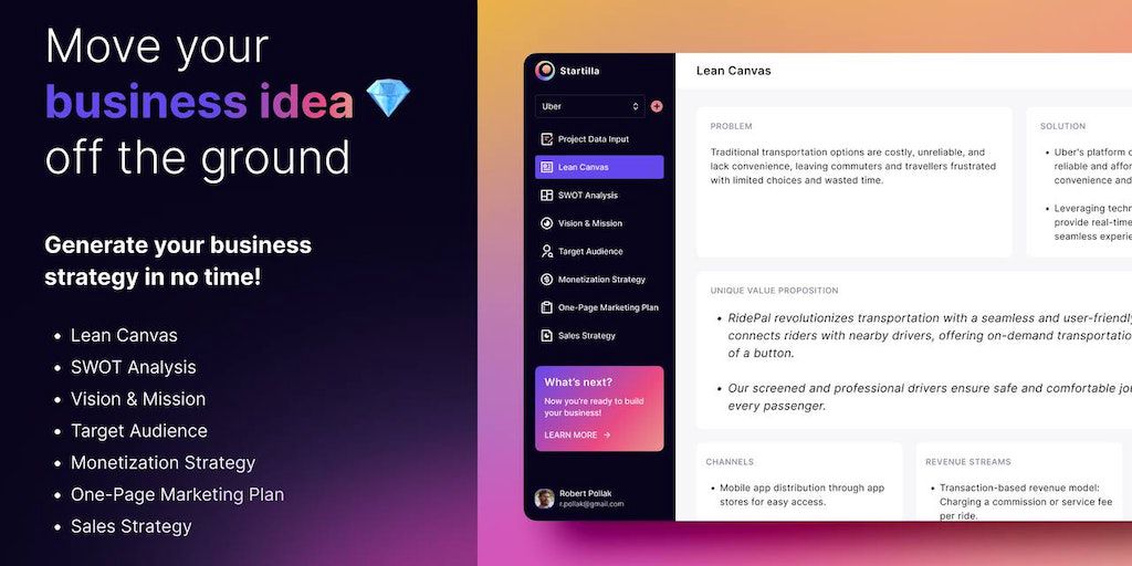 Startilla is an AI assistant that helps startup owners, business analysts, marketing agencies, and UX designers generate essential business artifacts ready for idea validation and project pitch.