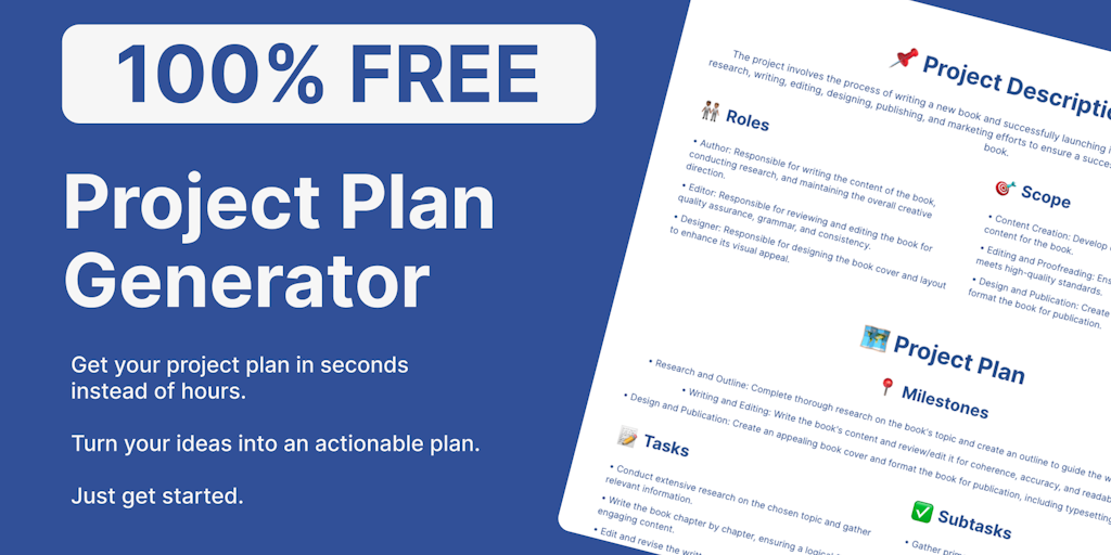 Generate actionable Project Plans in seconds instead of hours. Get everything you need for a successful project. 100% FREE. Done by AI.