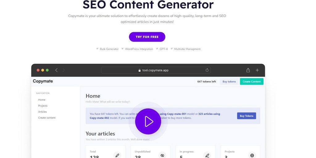 Copymate is your ultimate solution to effortlessly create dozens of high-quality, long-term and SEO optimized articles in just minutes! Publish created content directly to your WordPress site. Write c