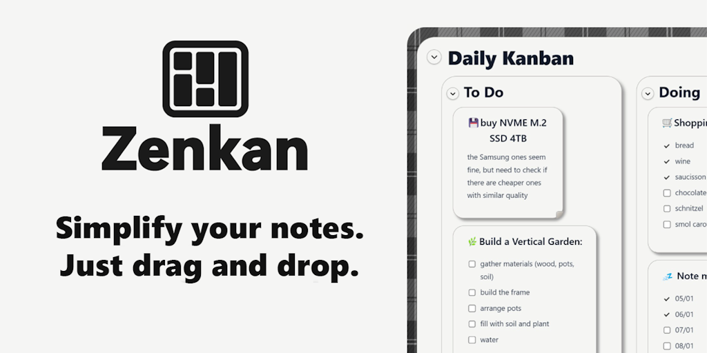 Zenkan is a personal note-taking app with a 3-level nested board system for effortless organization. Drag, resize, and arrange your notes and tasks freely in a flexible workspace with Markdown support