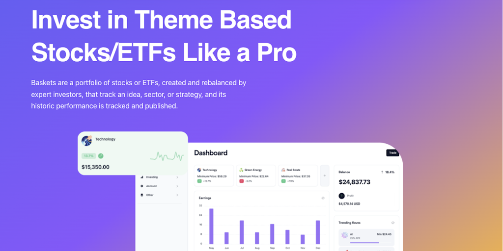 Invest in Theme Based Stocks/ETFs Like a Pro Baskets are a portfolio of stocks or ETFs, created and rebalanced by expert investors, that track an idea, sector, or strategy, and its historic performanc