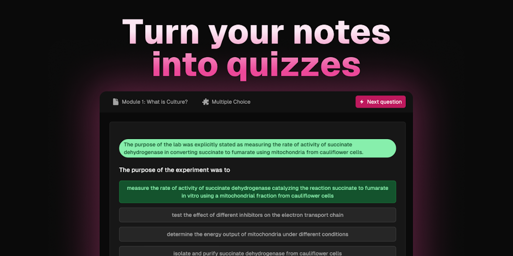 Turn your notes into interactive quizzes. Simply import your notes, and generate practice exams in seconds. Get feedback on your answers and share your quizzes with your friends and classmates. Sign u