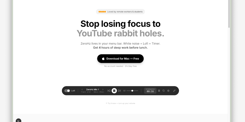 Stop losing focus to YouTube rabbit holes. ZeroHz lives in your Mac menu bar with curated lofi music, 12 ambient sounds, and a built-in timer. Get 4 hours of deep work before lunch—no account needed.