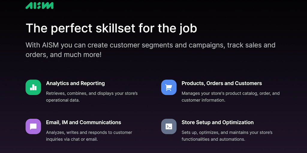 AISM is an AI assistant designed to help users effortlessly manage their online stores via chat. For now you can ask it for more information about your sales, customers and orders, but very soon you w