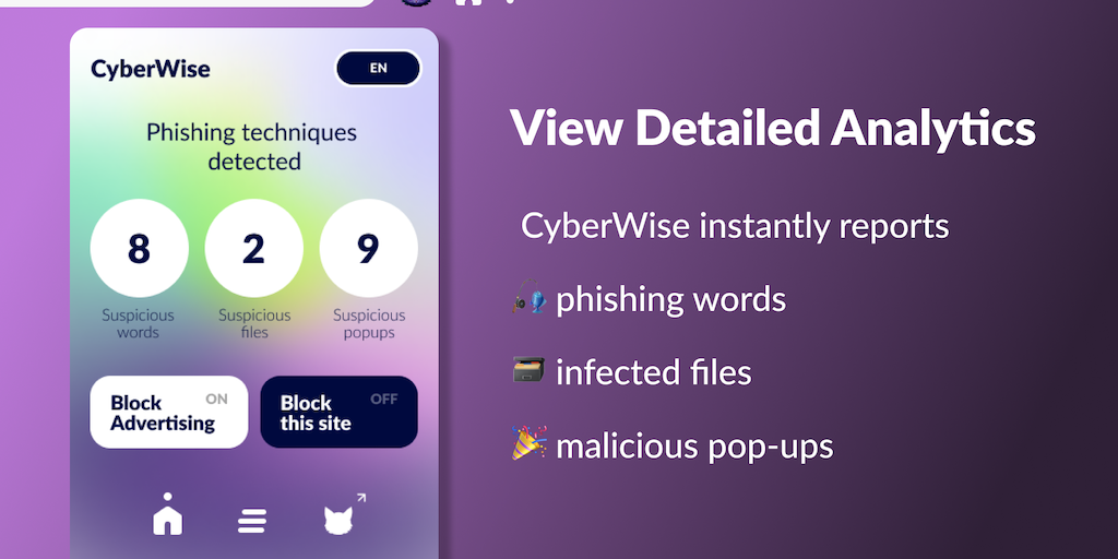 CyberWise detects cyber threats for people speaking 10+ different languages πΎπ Feature highlights: - Phishing reports - Infected file download prevention - Suspicious pop-up detection - Ad blocking -
