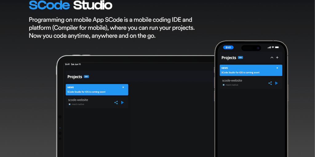 Programming on mobile App. SCode Studio is a mobile coding IDE and platform (Compiler for mobile), Where you can run your projects. Now you code anytime, anywhere and on the go.