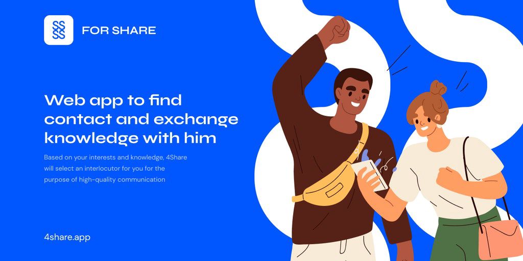 4Share - Web app to find people and exchange knowledge đšī¸ 4Share find an interlocutor based on your knowledge and topics of interest đ§đŊâđ¤âđ§đŊ Meet, share knowledge and expand your network đ Communicate