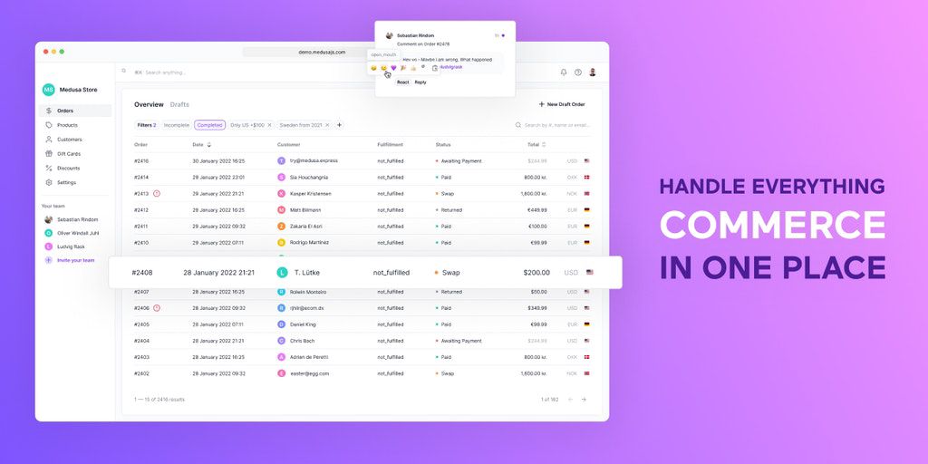 Medusa is an open source headless commerce platform. Use our building blocks and customize your setup in any way you want. Easy to set up with plug-n-play integrations to payments, CMSs, shipping, ana