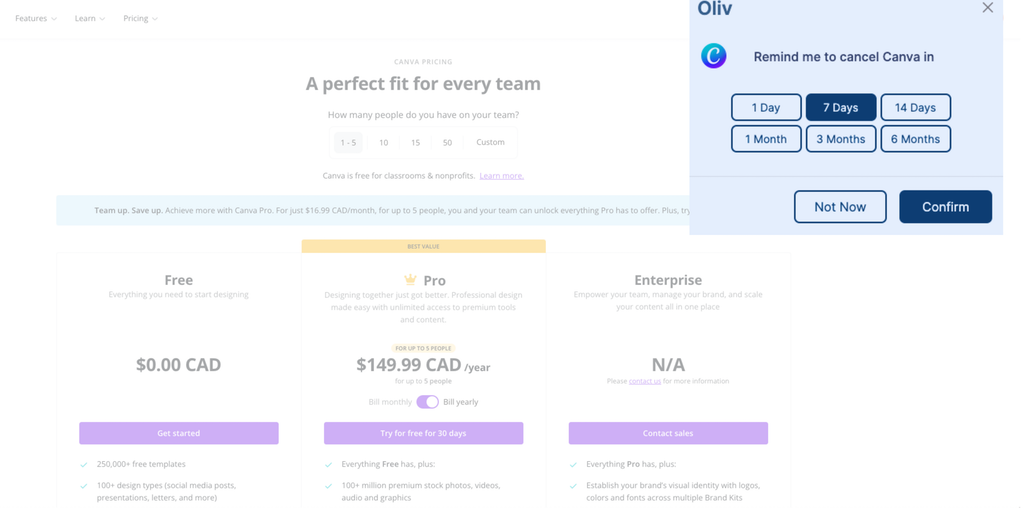 Oliv is a browser extension which automatically reminds you to cancel your trials and subscriptions. Similar to honey, Oliv pops up when it notices you're signing up for a trial or a new subscription and with just one click you can setup multiple reminders