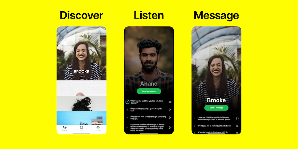 Each day, discover 5 new people from across the world. Listen to their audio interviews in a playlist/podcast format and message anyone that piques your interest.