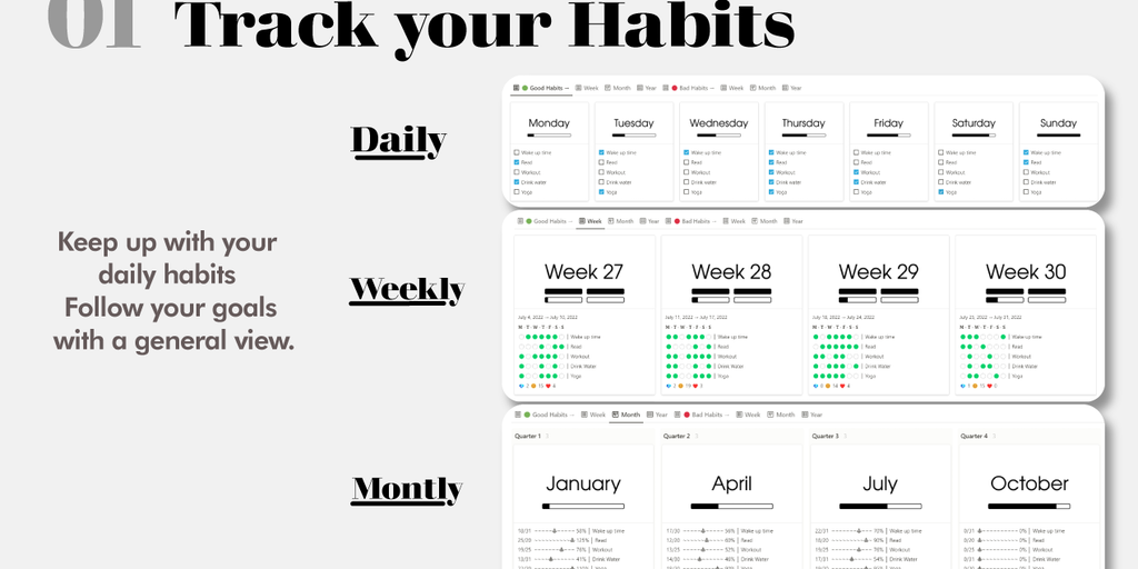This Habit Tracker is special, because not only tracks your good habits. Also, helps you break bad habits, reach your goals and keep motivated with a gamified system.