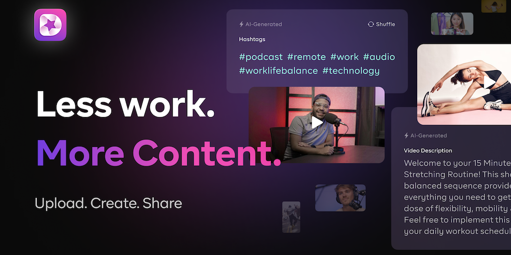 Turn your longer content into short, shareable videos in minutes. Upload any video with a least one minute of speech and get AI-generated highlights, ready to share on social media and beyond. And aut
