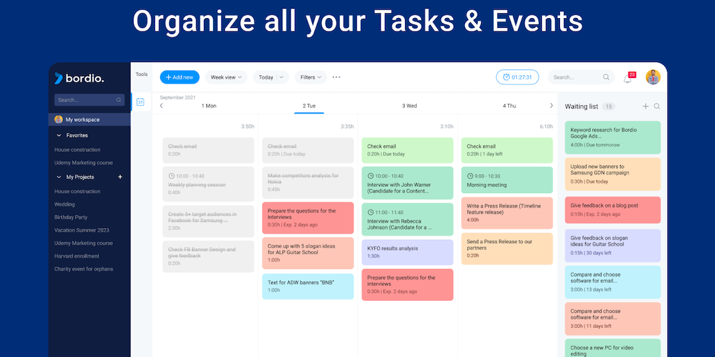 Bordio is a productivity platform for organizing all your tasks, events, and projects in one single place. Schedule your activities right in the calendar or put "someday tasks" on the waiting list and