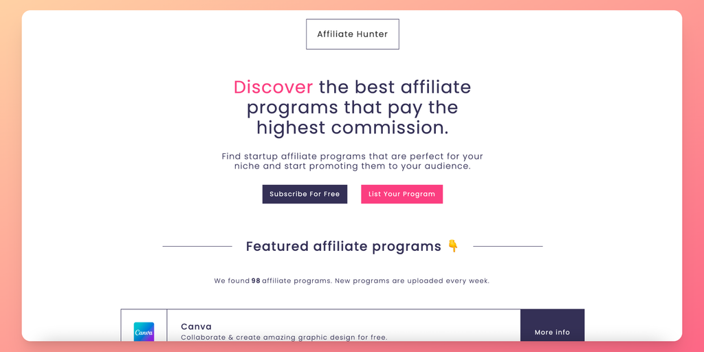 Best Affiliate Programs (by Affiliate Hunter) is a curated directory of 100+ of the best startup affiliate programs that pay the highest commission.