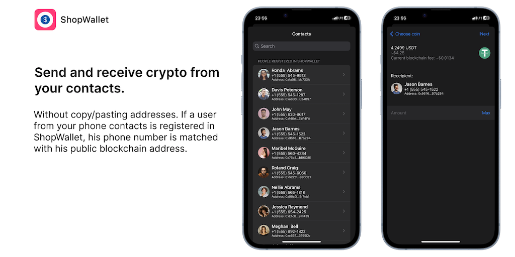 Send and receive crypto from your contacts. No more need to copy/paste addresses. Send and receive USDT, USDC, ETH and MATIC. ShopWallet is a self-custodial wallet.