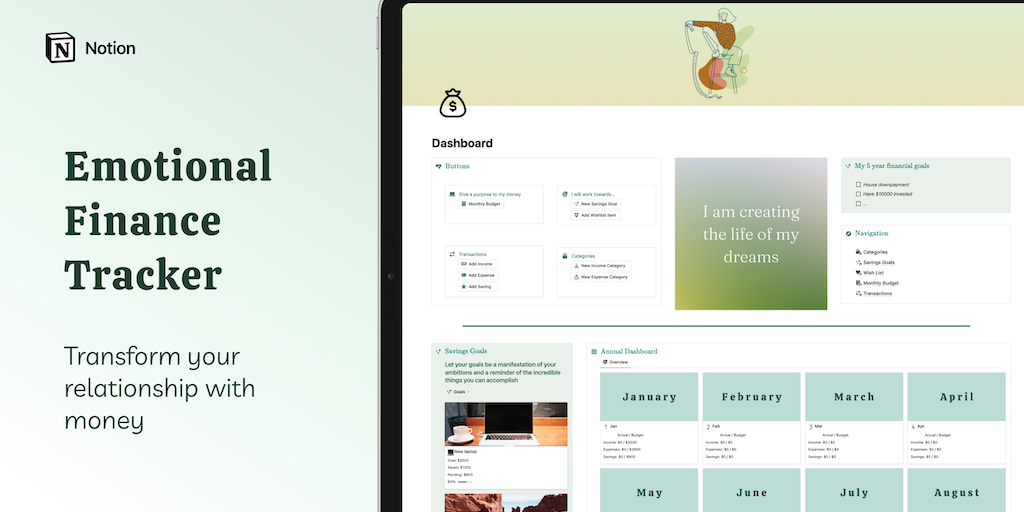 Take control of your financial well-being with the Emotional Finance Tracker Notion Template. Track income and expenses, set savings goals, understand your spending triggers and reflect on your latest