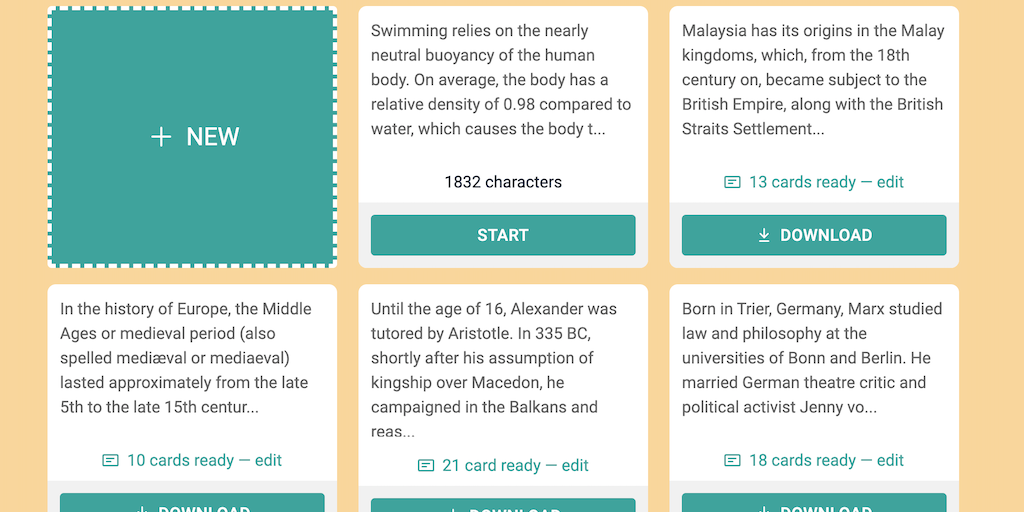 AI To Cards is a simple tool which converts any piece of text into flashcards. These flashcards can be exported and practiced with in any repetition system like Anki.