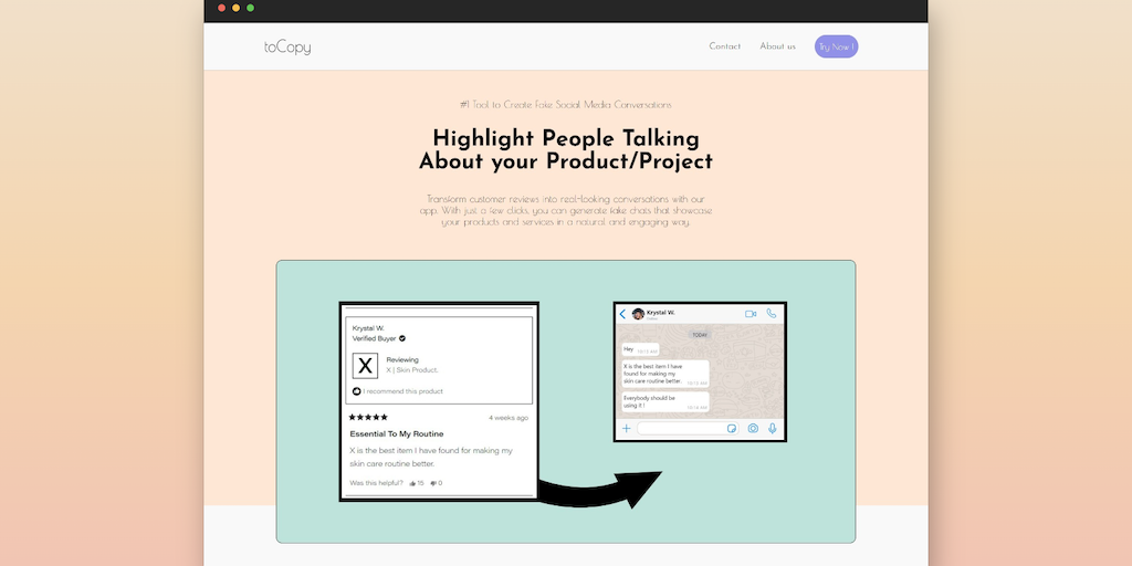 With toCopy, highlight people talking about your product. Transform customer reviews into real-looking conversations. With just a few clicks, you can generate fake chats that showcase your products an