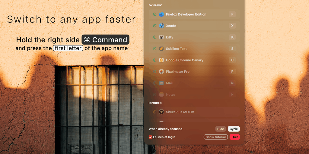 rcmd makes app switching instantaneous! When you have a lot of apps open, finding and switching to them might feel too slow using Command-Tab or the Dock. Hold down the right side |⌘ command| and press the first letter of the app name to focus it.