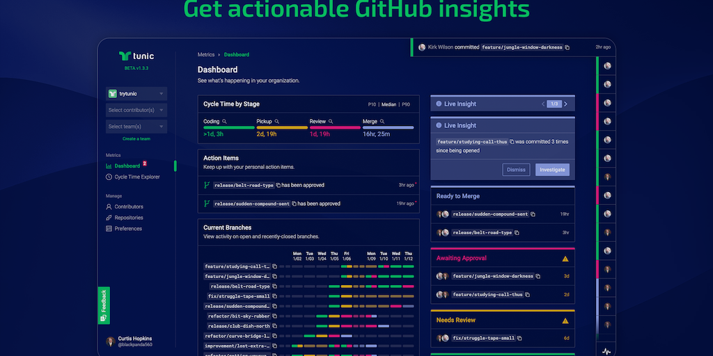 Tunic helps dev teams measure and improve the quality of their development processes through their existing GitHub exhaust. Tunic provides real-time insights about what your team is working on, where