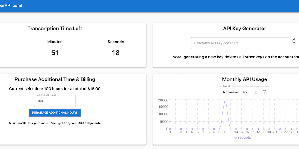 This is an affordable, easy-to-use audio transcription API powered by OpenAI Whisper. Simply sign up on the dashboard, generate an API key, buy credits, and start using the API!