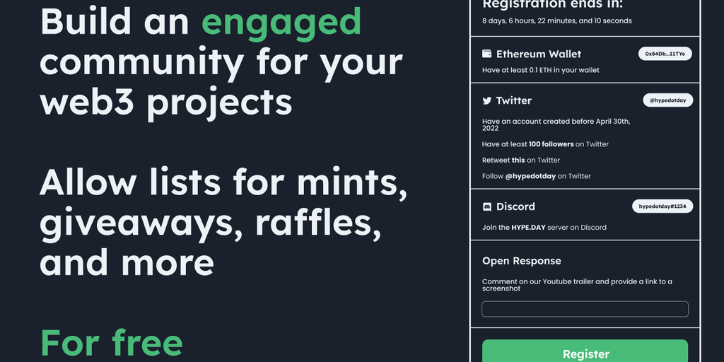 Get high-quality registrations for your web3 project's mints, giveaways, and raffles. All for free. Allow user registration based on: - Wallet balance - Holding a specific NFT - Twitter follows and re