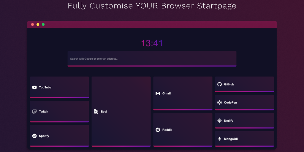 Organise your browser startpage any way you want! Plot your most visted sites and important bookmarks in grid layouts; whether that be in simple columns, or by using the sizes of rows to dictate their