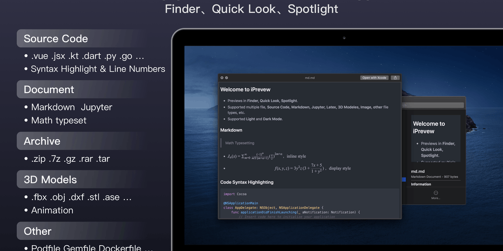 This App solves the problem that some files cannot be previewed in macOS Quick Look, and provides many practical functions, such as Code Highlighting, Markdown & Jupyter rendering preview, etc. Help y