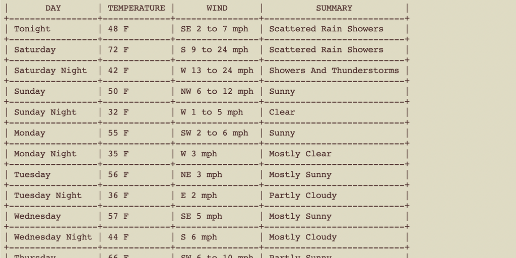 Weather forecasts in your terminal that just works. No API keys or configuration required. Just download and run. Useful for writing scripts to run multiple weather forecasts in parallel.