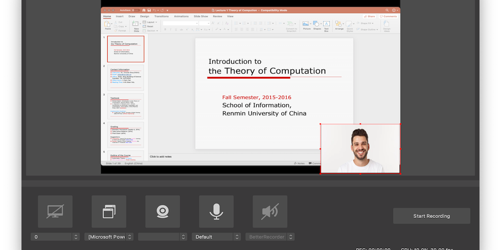 BetterRecorder is a screen recorder for mac, it can record screen with desktop internal audio, webcam video and microphone audio. It is easy to use.
