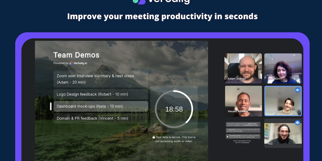 Verbally is your free meeting helper. Display & time-box your agenda, stay on time with meeting & speaker timers, plus more. Works in seconds with Zoom & Google Meet. Empower your meetings with effici
