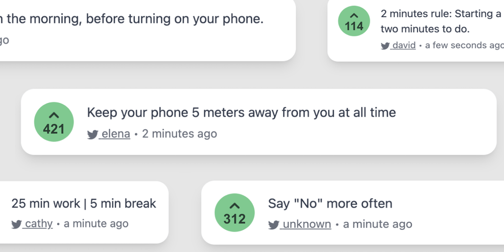 Anyone can write tips that help them get things done—no account needed. The internet upvotes the best ones. You get a crowdsourced list of the top productivity tips!