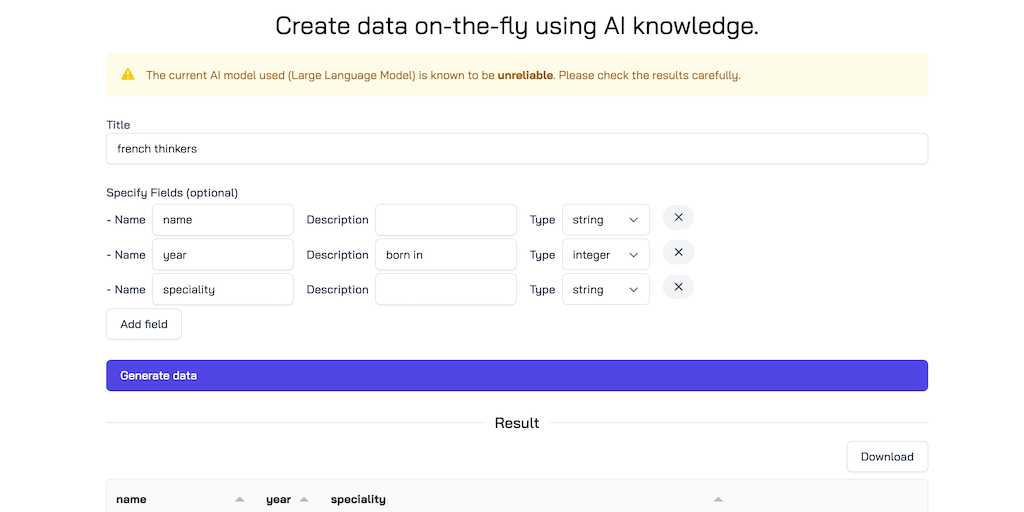 Universal Data Generate is a small tool to generate data using GPT-3. It's purely experimental and generated data need to be taken with precaution...but it's fun, so I'm sharing it.