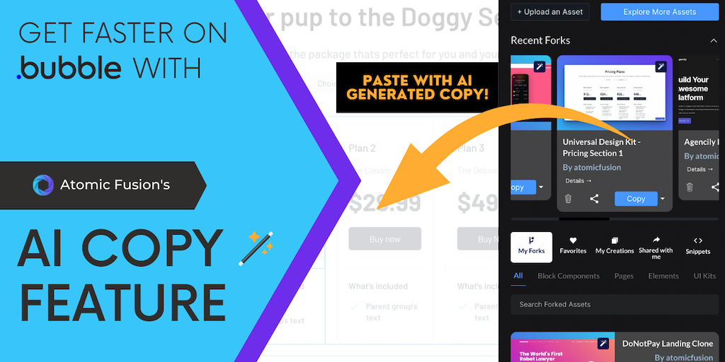 Atomic Fusion's AI Copy feature enables you to build Bubble pages/sections literally in seconds. Simply provide context about your Bubble app and Atomic Fusion generates components or pages with meani