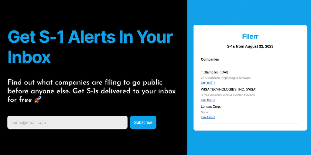Every week, companies file S-1s to go public but there's no easy way to be notified about them. Filerr is a free service that tracks and sends notifications for S-1s.