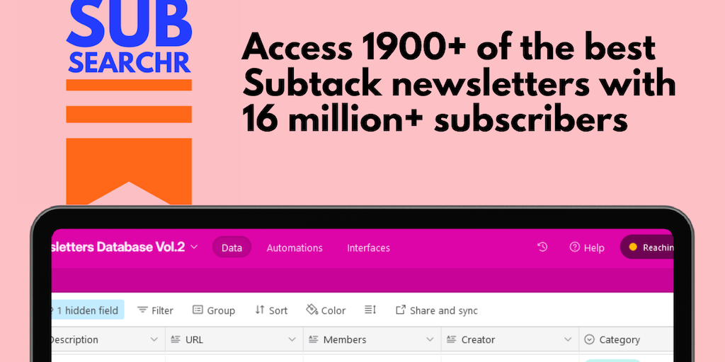 Subsearchr is your ultimate gateway to a database of over 1900+ carefully curated and highly-subscribed newsletters. With a collective readership of a staggering 16,163,000 people, use it to get valua