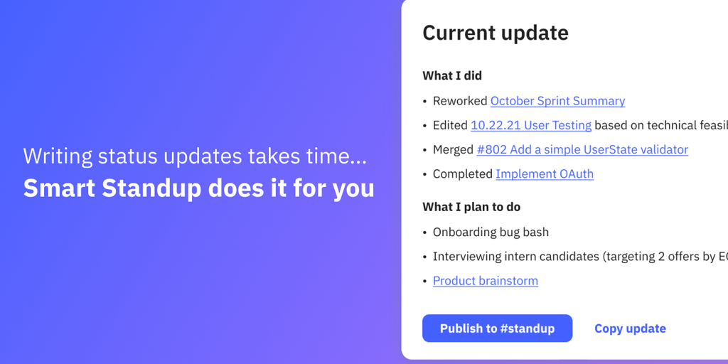 Writing status updates takes time. Smart Standup does it for you. Connect the apps you use and Smart Standup will summarize your work at the frequency you choose.