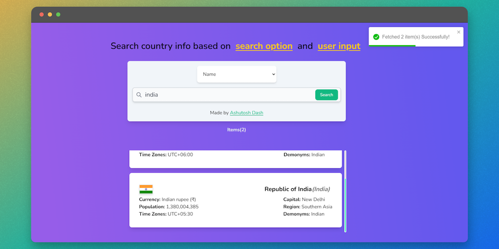 A simple tool to get country info based on search options like name, language, currency and input field for the respective search options.