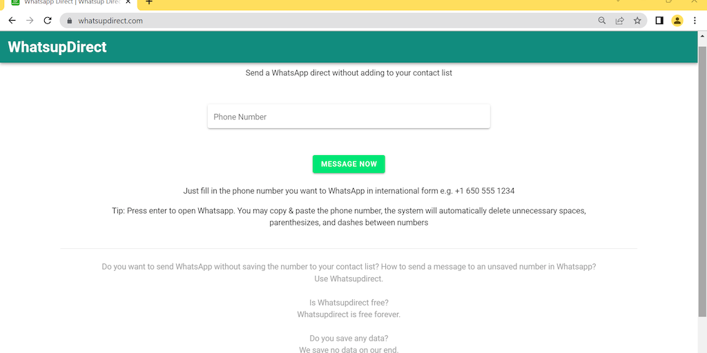 Send a WhatsApp message to any phone number without saving it to your contact list. Enter the mobile number, click on "MESSAGE NOW", WhatsUpDirect will convert the number into an official openable Wha