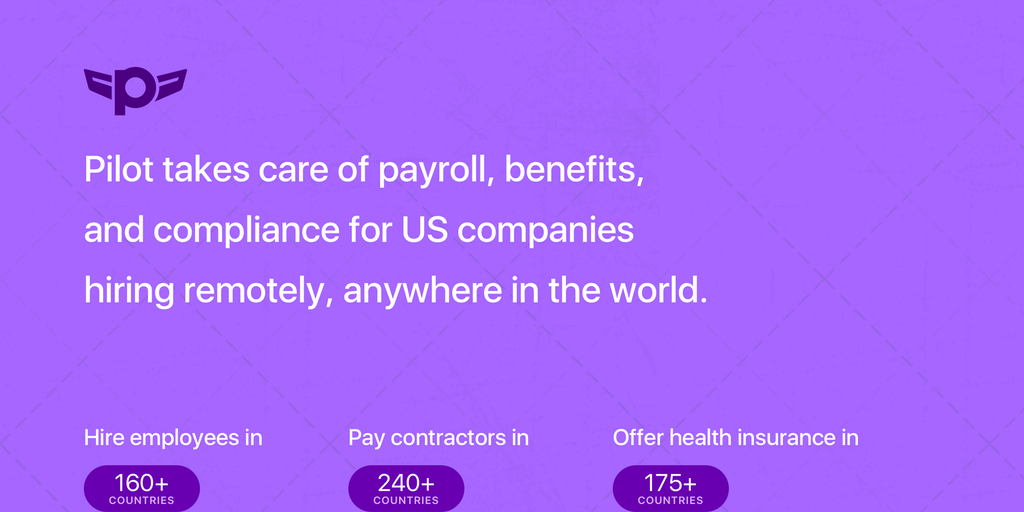 Pilot provides payroll, benefits, and compliance for US-based companies with remote teams. Easily onboard and pay employees in 160+ countries and contractors in 240+ countries. Offering special pricin