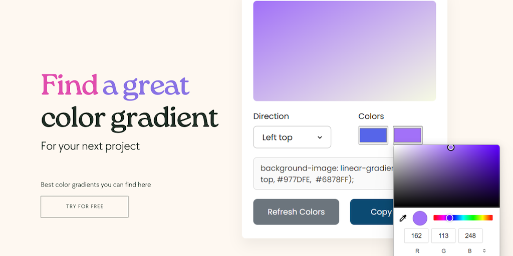 What is Gradientspace? Gradientspace is a simple gradient color generator for creating backgrounds, fonts, etc.