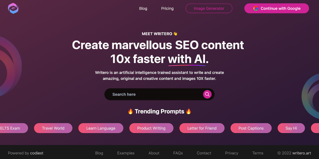 Writero is an artificial intelligence-trained assistant to write and creates unique, original, and creative content and images 10X faster