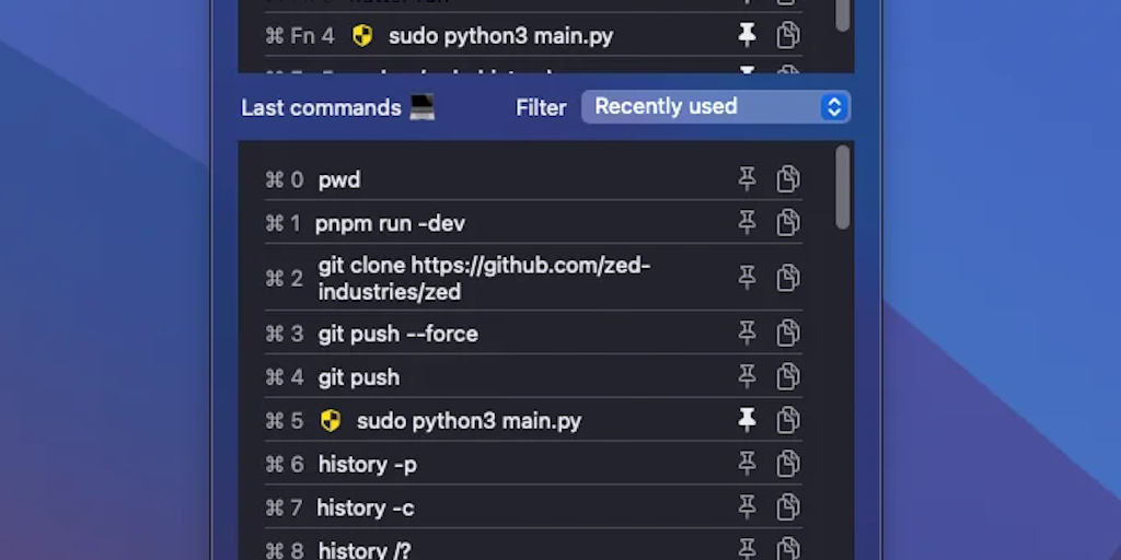 Zshistory is a small Mac menu bar app that allows you to search through your recent terminal commands, so you never forgott a command again. It currently supports only zsh, which is the default shell
