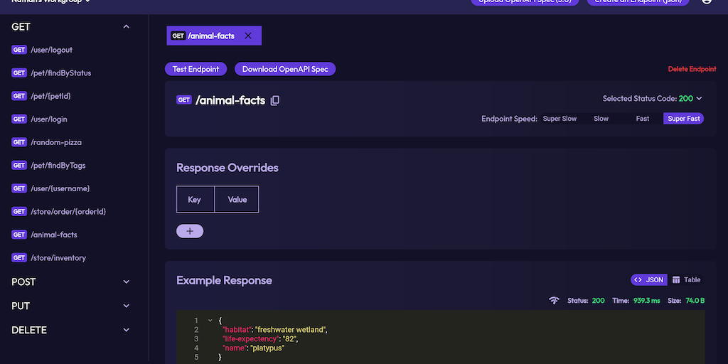 Platpi seamlessly converts OpenAPI docs into fully functional mock endpoints, with pseudo-realistic data, with the click of a button. Override response values, change status codes and speeds, all with