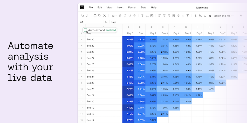 Instantly turn spreadsheets into dashboards powered by live data and auto-distribute up-to-date reports to Slack, email, and Slides - all in a few clicks. Drag and drop to add cells, tables, and chart