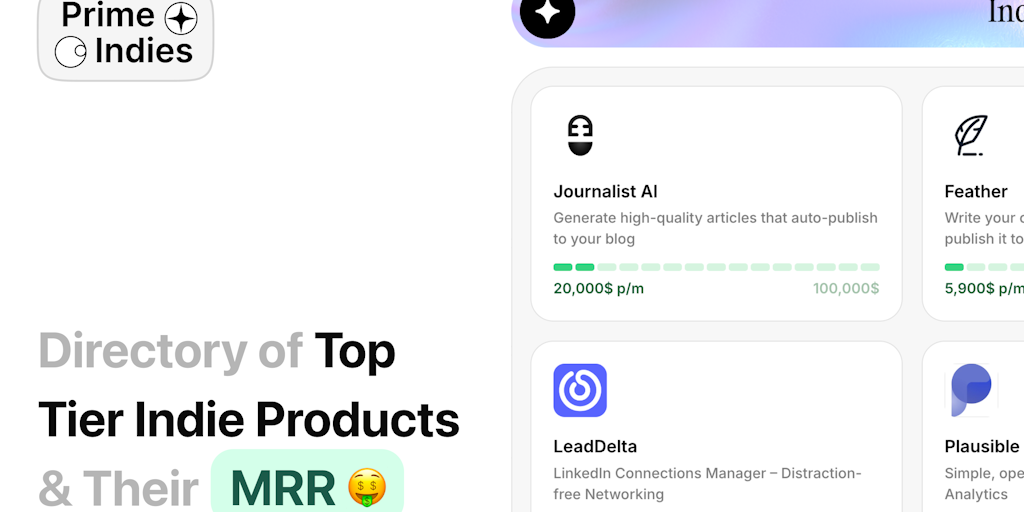 Prime Indies - Discover top-tier indie products and how much MRR they make | Product Hunt