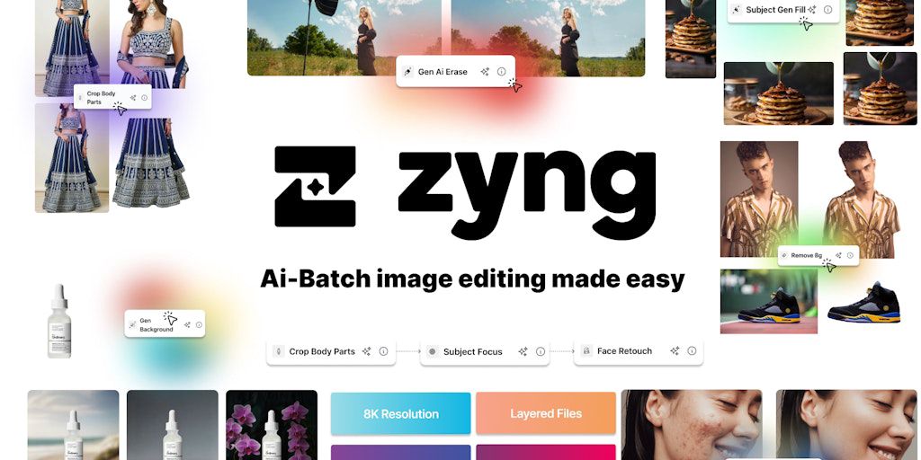ZYNG AI automates bulk image editing with smart AI tools like background removal, intelligent cropping, and generative fills and backgrounds. Edit 100's of images with consistent, professional results